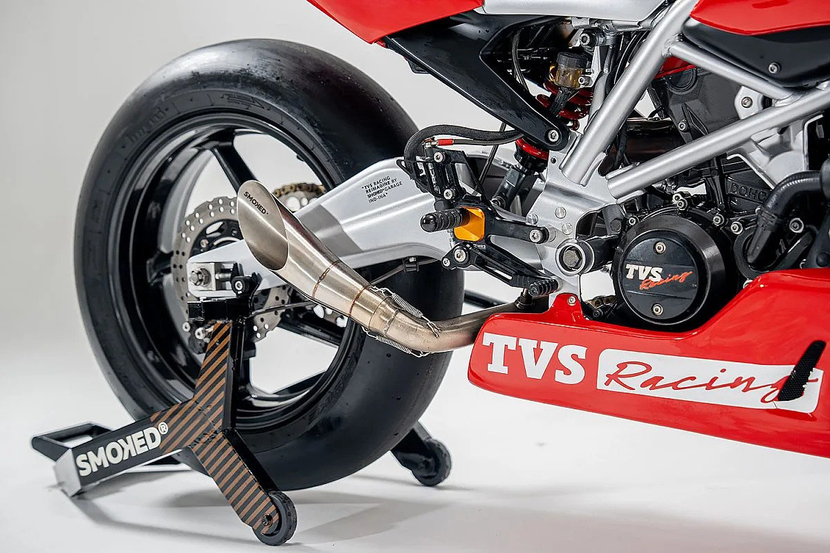 Las llantas de aleación calzan neumáticos slics (el trasero de 200 mm), lo que obligó a fabricar un nuevo basculante, al que va anclado un monoamortiguador Öhlins. El freno delantero monta una pinza de cuatro pistones, con un conducto de aire que mejora la refrigeración.