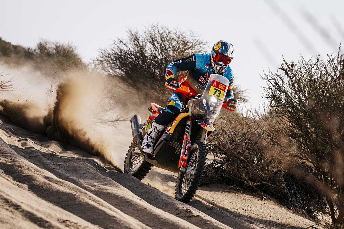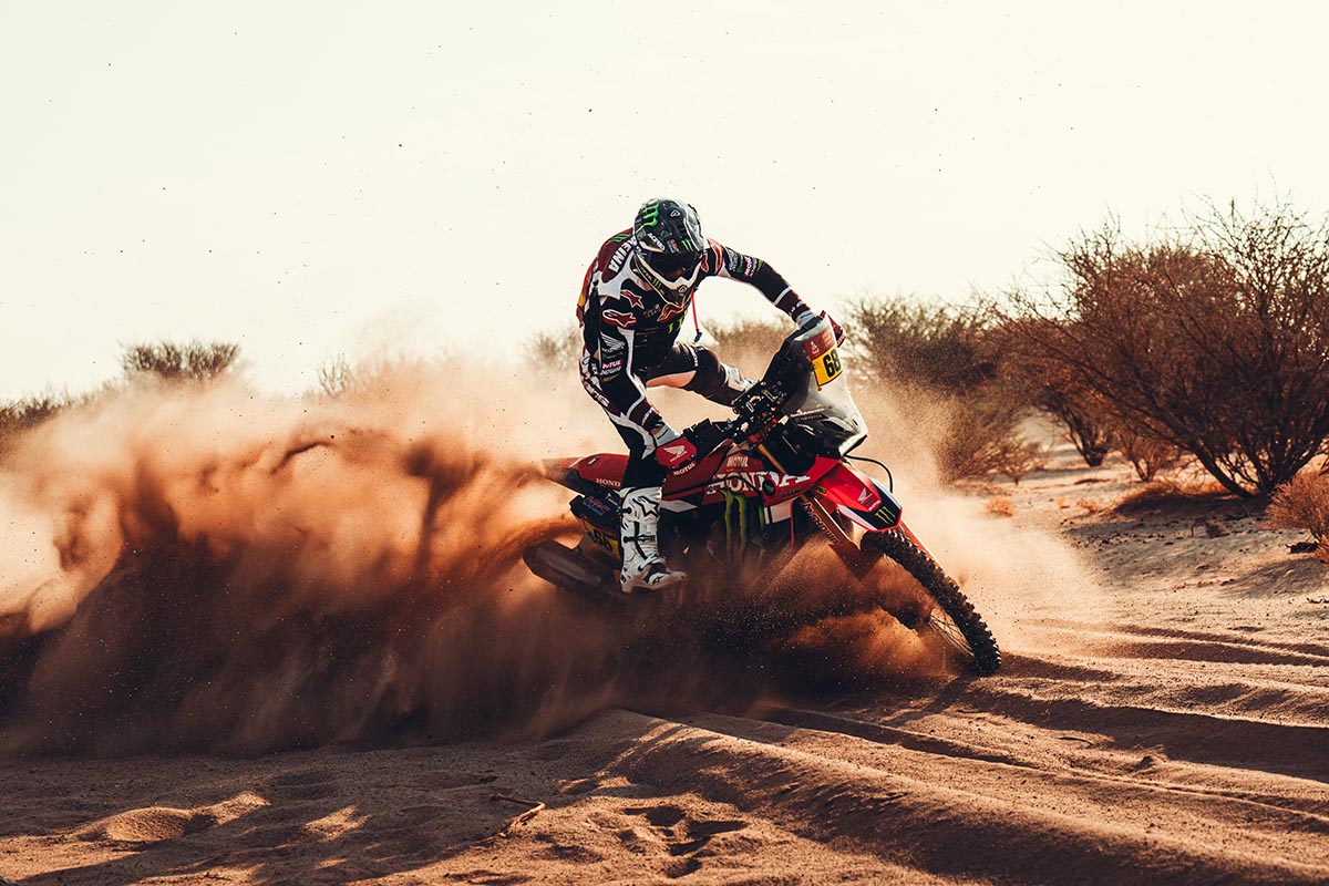 En su octava participación en el Dakar, Skyler Howes consiguió por fin su primera victoria de etapa, y lo hizo con autoridad. El estadounidense, a los mandos de su Honda CRF450 RALLY, se sintió cómodo en un terreno rocoso que encajaba perfectamente con su estilo y supo mantener un ritmo altísimo sin fallar en la navegación.