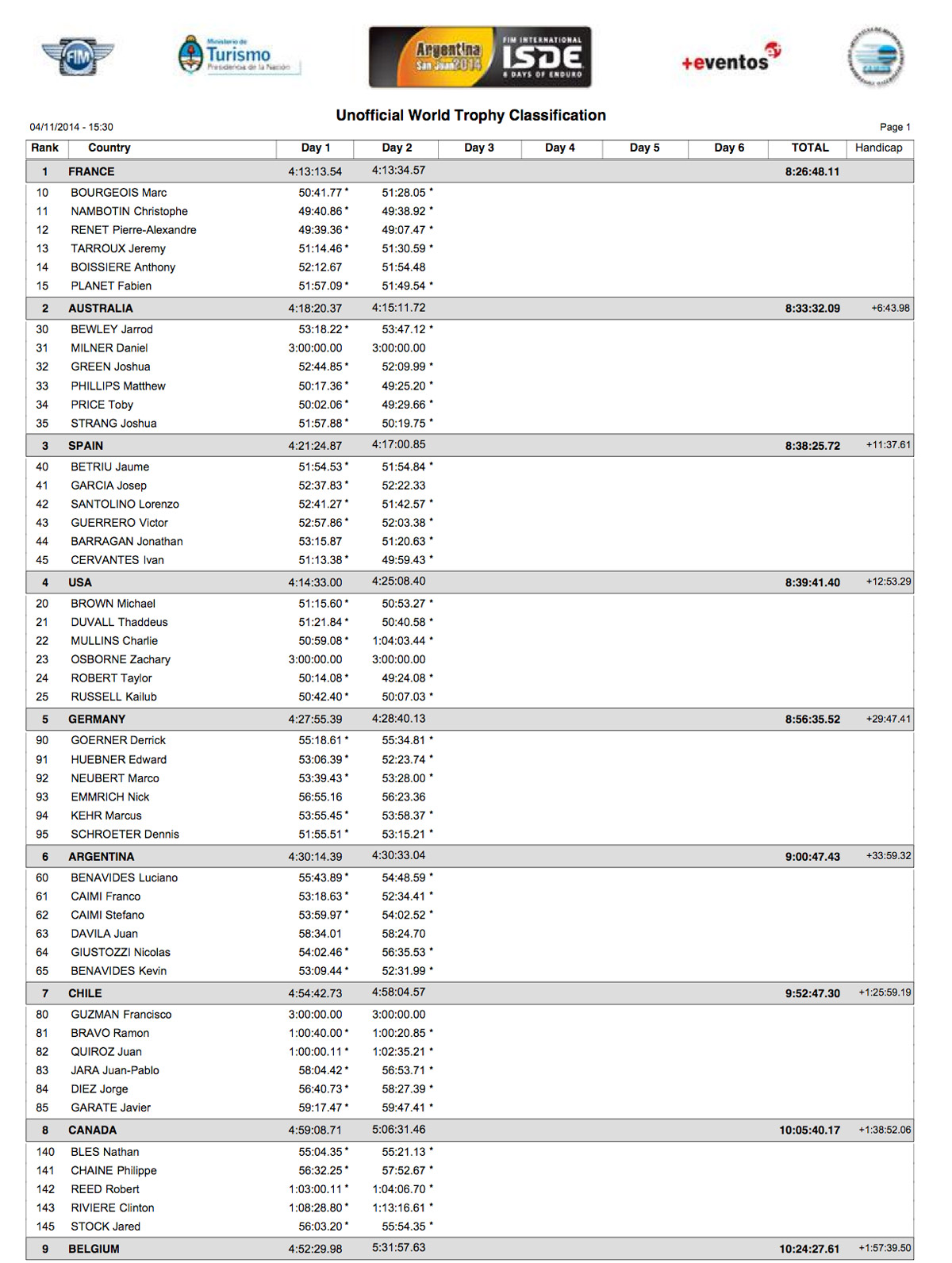 CLASIFICACIÓN TROFEO DIA 2 ISDE ARGENTINA 2014