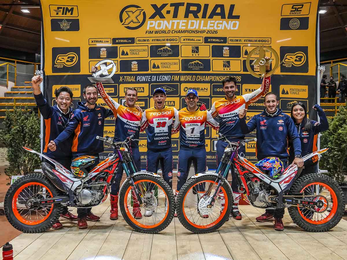 El Repsol Honda HRC firmó un fin de semana perfecto en el estreno de Ponte di Legno en el Mundial X-Trial 2026. Toni Bou volvió a imponer su dominio con dos victorias consecutivas, mientras Gabriel Marcelli completó sendos dobletes que refuerzan el liderato del equipo antes del parón navideño.