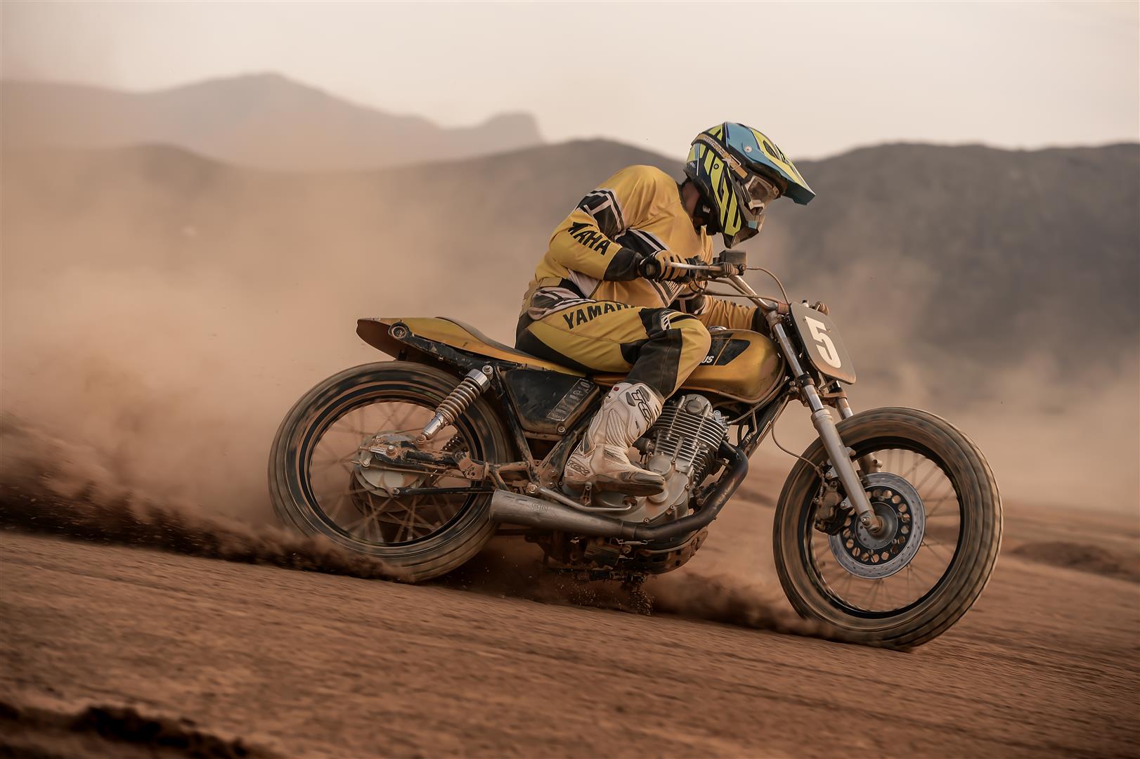 La escuela Di Traverso ha escogido las Yamaha SR400 para sus alumnos. Una moto fiable y robusta ideal para iniciarse en el Dirt Track. Las motos han pasado por las manos de Deus Ex Machina para ser adaptadas a la pista incorporando manillares más altos, escape bajo, asiento con colín integrado y suspensiones rebajadas. Además se ha quitado la batería y el arranque eléctrico para bajar un poco más su peso. Aunque la filosofía del Dirt Track es no llevar maneta de freno delantero en este caso se mantiene para dar confianza a los alumnos. Las gomas típicas de la especialidad terminan de dar el toque racing a las motos.