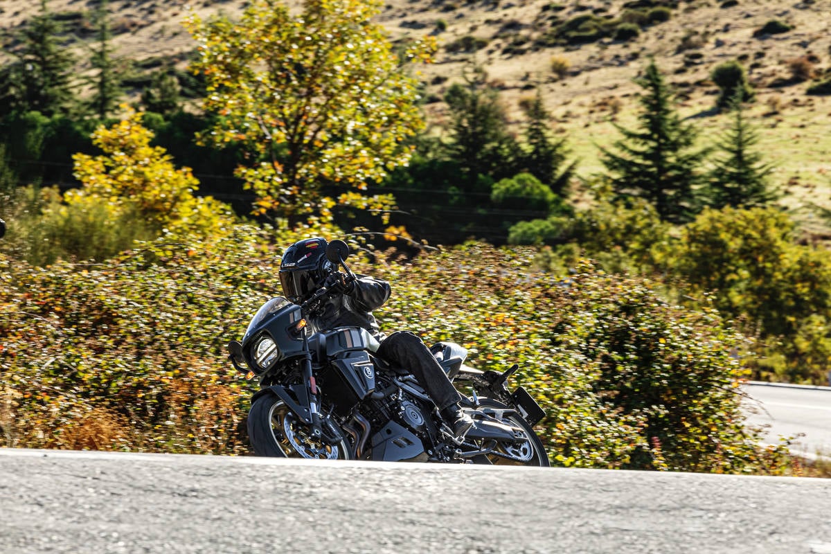 Y es que esta moto se adapta perfectamente a todos los escenarios que te encuentras en una carretera abierta, personalmente la postura me va de maravilla, me permite pasear disfrutando del paisaje, pero en un tramo bonito de curvas también puedo disfrutar de una conducción más deportiva. Se aguanta bien, frena muy bien, las suspensiones trabajan de maravilla y el motor no es el más potente de su categoría, pero tiene un rango de utilización fantástico. Permite abordar virajes cerrados de puertos de montaña en una marcha más larga y salir abriendo el gas sin problemas con una aceleración constante y musculosa. El cambio con su quickshifter funciona muy bien al subir marchas, en cambio al reducir me gustó menos, es más brusco y obliga a trabajar más al embrague antirrebote, con lo cual le ayudaba, dando un ligero golpe de gas.