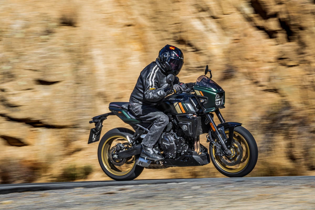 Aquí no hay nada nuevo, utilizan el mismo bastidor de doble viga de acero de la gama GSX-8 y basculante de aluminio. La geometría está pensada para ofrecer buena estabilidad en línea recta y suficiente agilidad para mover la moto con rapidez en los cambios de dirección. En el tren delantero encontramos una horquilla invertida KYB USD con recorrido de 130 mm y detrás un mono-amortiguador con bieletas KYB, con ajuste de precarga de muelle. Los frenos no son “vintage”, monta doble disco delantero de 310 mm con pinzas radiales Nissin, un disco trasero de 240 mm con pinza simple y el sistema ABS está presente como parte de las ayudas modernas.