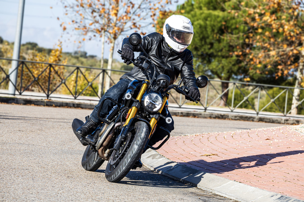 Si nos empeñamos en aguantar la marcha acelerando el corte de encendido entra, de manera algo brusca, cuando se sobrepasan solamente 6000 rpm. Los espejos retrovisores redondos, muy clásicos, no me acabaron de convencer. Cumplen con los cánones estéticos de las motos retro pero, al igual que ocurre con la pantalla TFT, pienso que si fuesen rectangulares ofrecerían una mejor visión de lo que ocurre a nuestras espaldas. A partir de las 4000 rpm el monocilíndrico empieza a vibrar, lo que se nota en los reposapiés y en el manillar. Al régimen máximo de 6000 rpm, debido a las vibraciones, apenas vemos nada por los espejos retrovisores. Por eso, es mejor pasar a una marcha más larga lo antes posible y aprovechar el mencionado buen carácter del motor desde abajo.