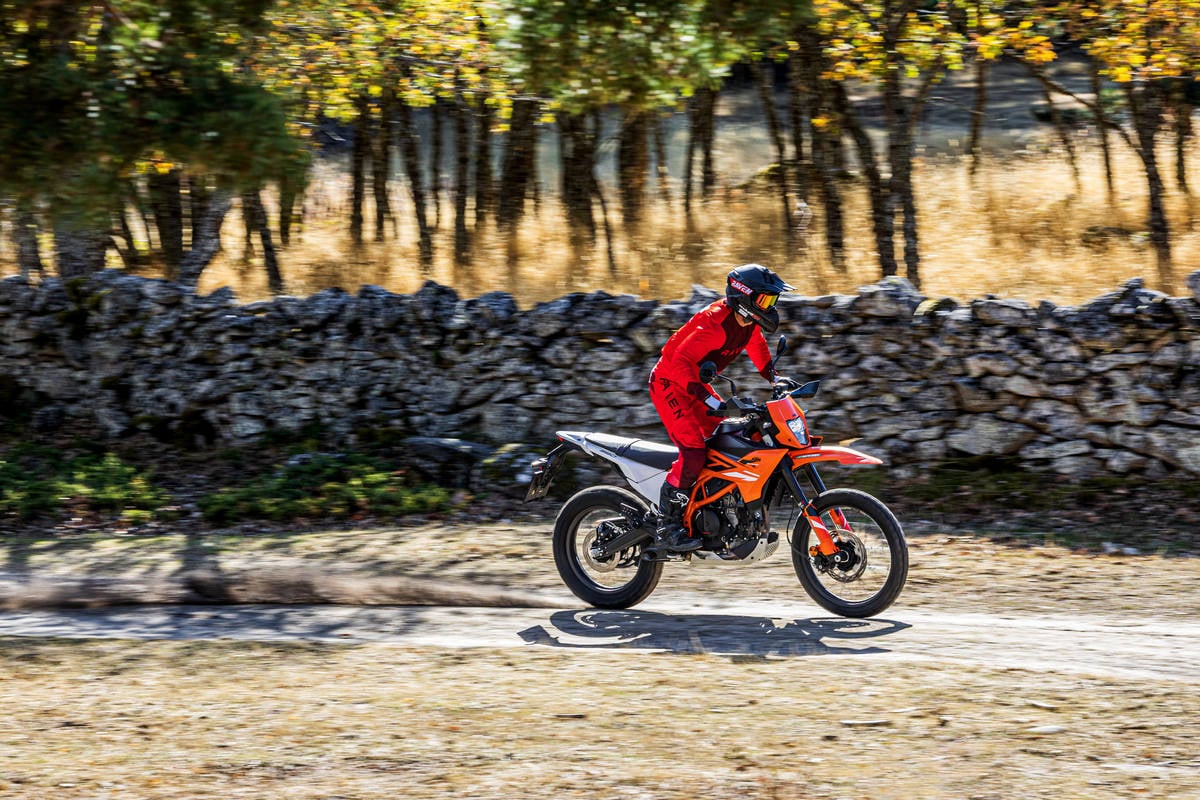 Tras la sesión de fotos, nos fuimos a probar más a fondo, caminos, pistas, senderos estrechos y carreteras reviradas. Ahí la 390 brilla. Es una moto muy válida en terreno variado: puedes rodar con grandes trail sin complejos y seguir el ritmo de enduro pequeñas si nadie pretende heroicidades. La agilidad está, el equilibrio general también.