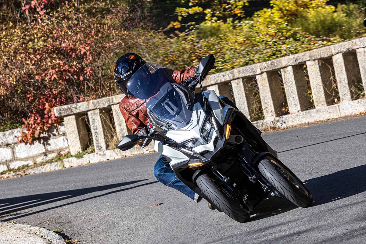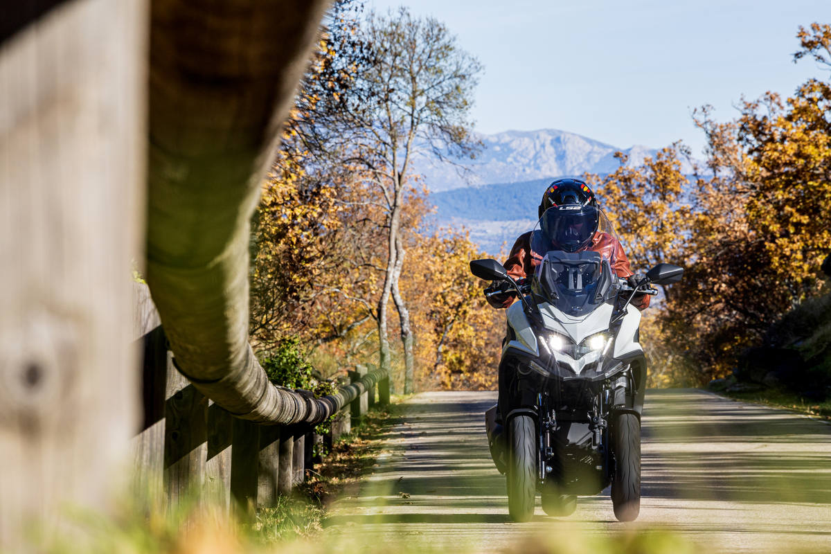 En carreteras de curvas de montaña me he divertido mucho, gracias a dos puntos fundamentales: su excelente motor, con una respuesta llena y dosificable y una retención perfecta cuando cortas gas (no como los embragues de rampas y variador que parece que te quedas en punto muerto cuando cierras el gas) y al buen comportamiento de su chasis y tren delantero. Me ha resultado segura, estable y a pesar de su generosa distancia entre ejes me ha sorprendido lo bien que la podía meter en horquillas y virajes cerrados y la seguridad que me transmite el tren delantero.
