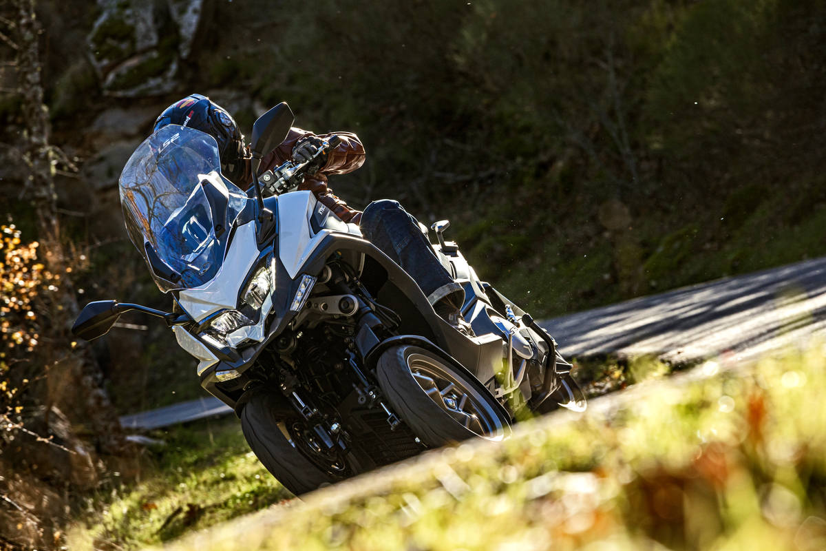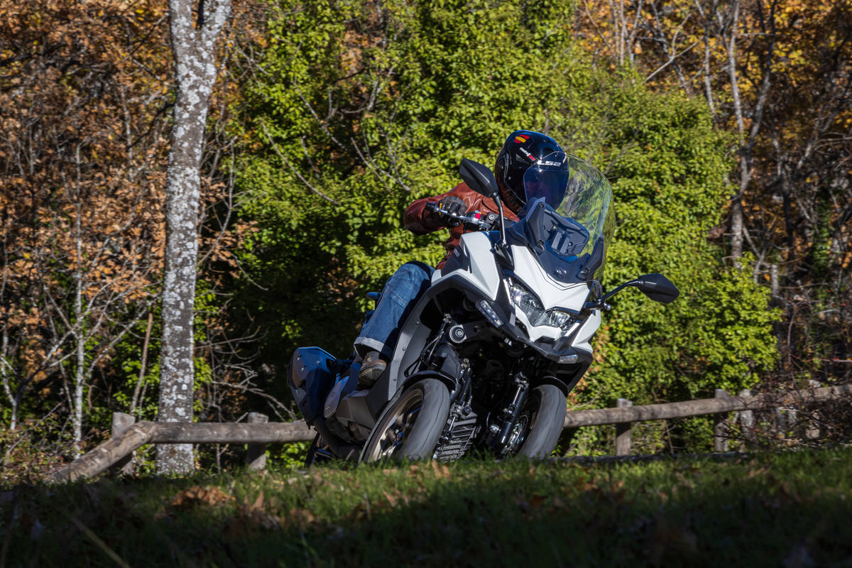 Como decía un poco más arriba, esto de las dos ruedas delanteras que se inclinan, para muchos representa un plus de seguridad y personalmente, comparto su opinión. Aunque con ello no quiero decir que no tengan otros inconvenientes o, cuidado, que no te puedas caer. Lo que sí es cierto, es que tiene mayor superficie de contacto el tren delantero con el suelo, por tanto más agarre (muy importante para mí) y las sensaciones de conducción son muy parecidas a las de una motocicleta convencional.