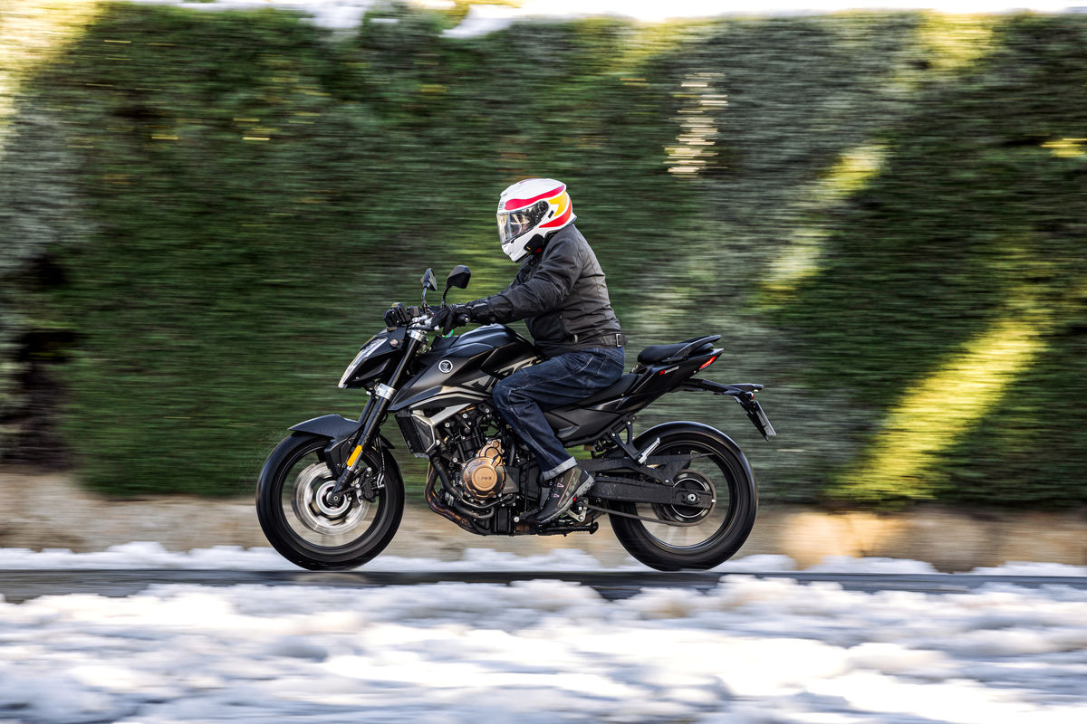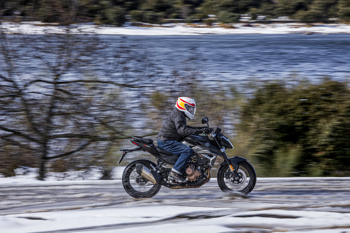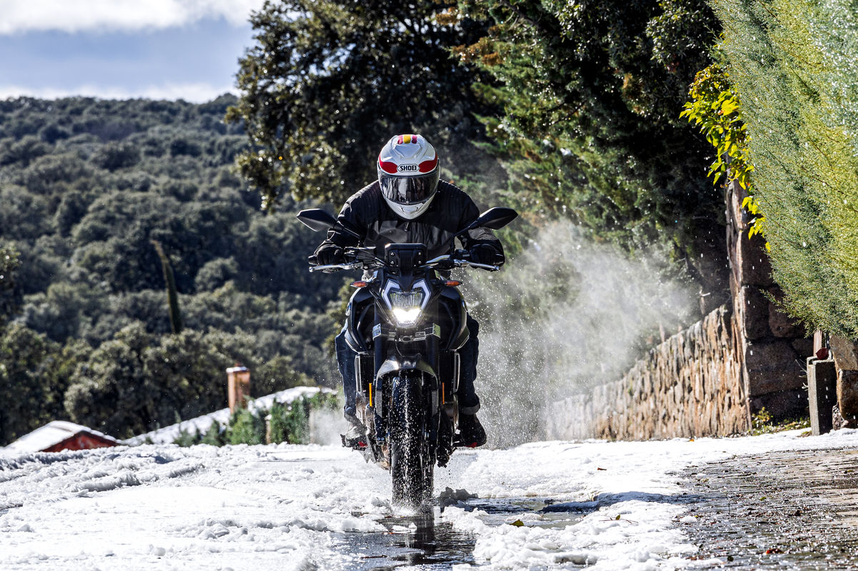 Sabes que las carreteras retorcidas de montaña son mi escenario favorito y justo ahí es donde noté de verdad la sinergia entre motor y parte ciclo, la siento viva, entras en curva con facilidad, vas superando tramos de virajes enlazados, moviendo la moto de un lado a otro con poco esfuerzo. Luego, cuando llegas a un “garrote” y tienes que frenar fuerte, es noble y la metes en la trazada por donde quieres, abriendo gas en una marcha más larga de lo que lo harías en una “500 del A2”, con más energía a la salida y más seguridad. Así puedo practicar una conducción más divertida y fluida. En terrenos más rotos filtra bastante bien los badenes y los baches, aunque en mi caso, por mis gustos personales, si hubiera podido habría regulado un poco más suaves las suspensiones en los dos trenes. Sin embargo, en virajes rápidos de autopista se mantiene firme, sin balanceos y va recta como una vela.
