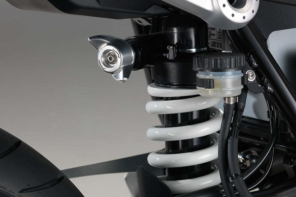 Las horquillas que permiten la regulación de su precarga suelen ofrecer esta posibilidad en la parte superior, en la cabeza de las botellas, mientras que los amortiguadores traseros podemos encontrar dos mecanismos, ya sea mediante dos grandes tuercas (tuerca y contratuerca) o mediante un pomo remoto. Si has entendido que al aumentar la precarga se acorta la longitud del muelle, te será fácil comprender que esto hace además reducir la altura del asiento de la moto respecto al suelo.